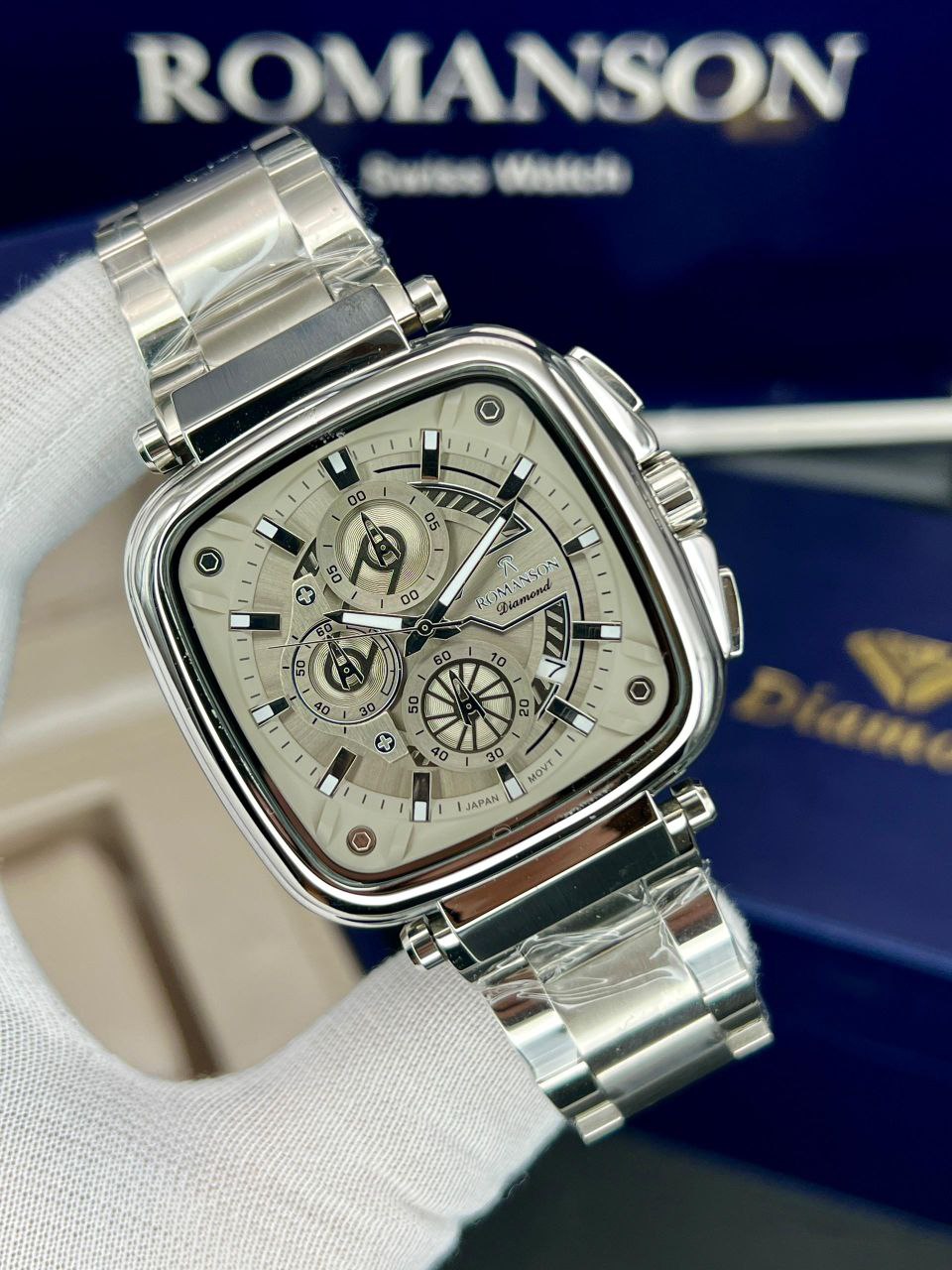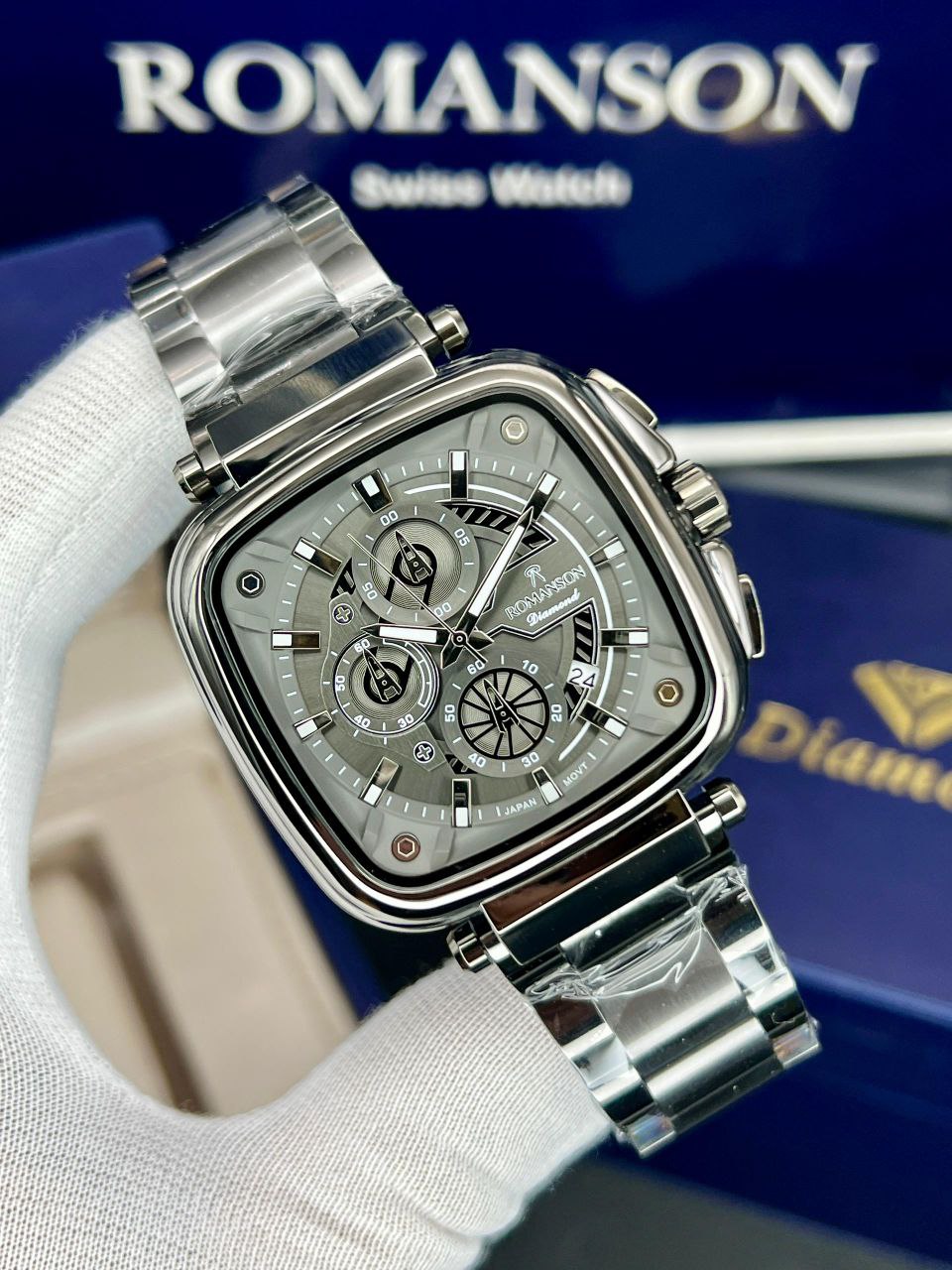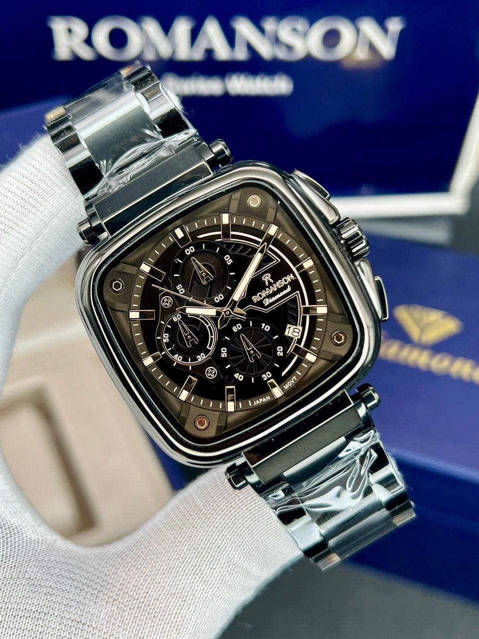رومانسون چهارگوش، موتور ژاپن، یکسال گارانتی شرکتی، مقاوم در برابر آب، شیشه سافیر ضدخش، سه موتور اصلی، ضد حساسیت