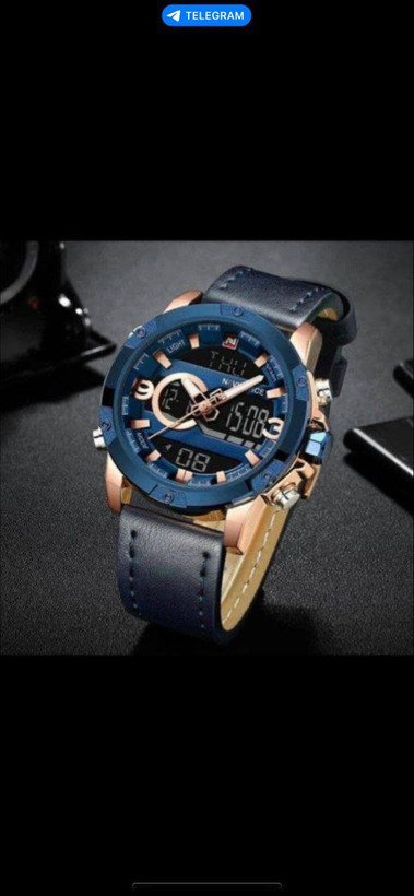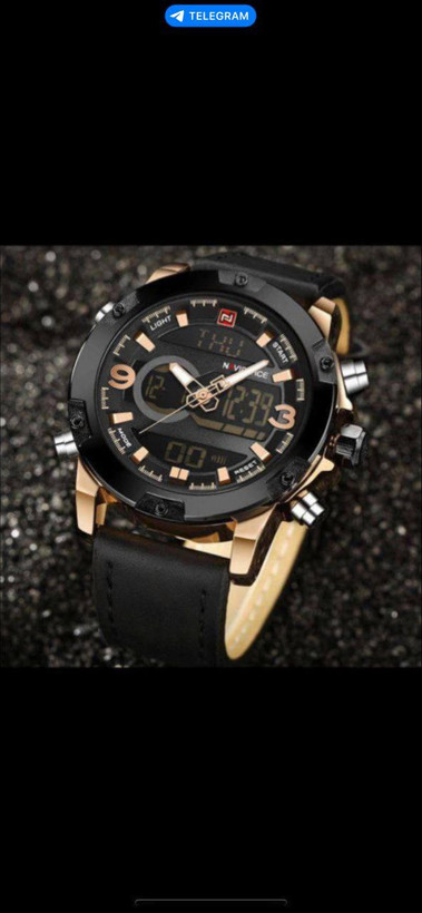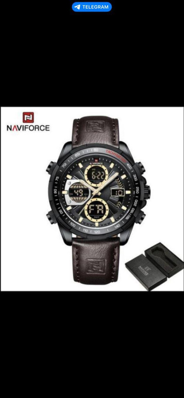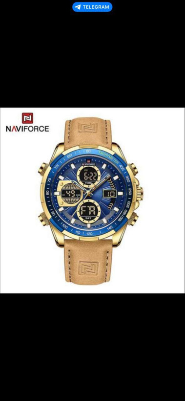ناویفورس بند چرمی ، دوزمانه ، مقام در برابر اب ، دارای زنگ ، چراغ ، کرنومتر ، شیشه سافیر ضدخش